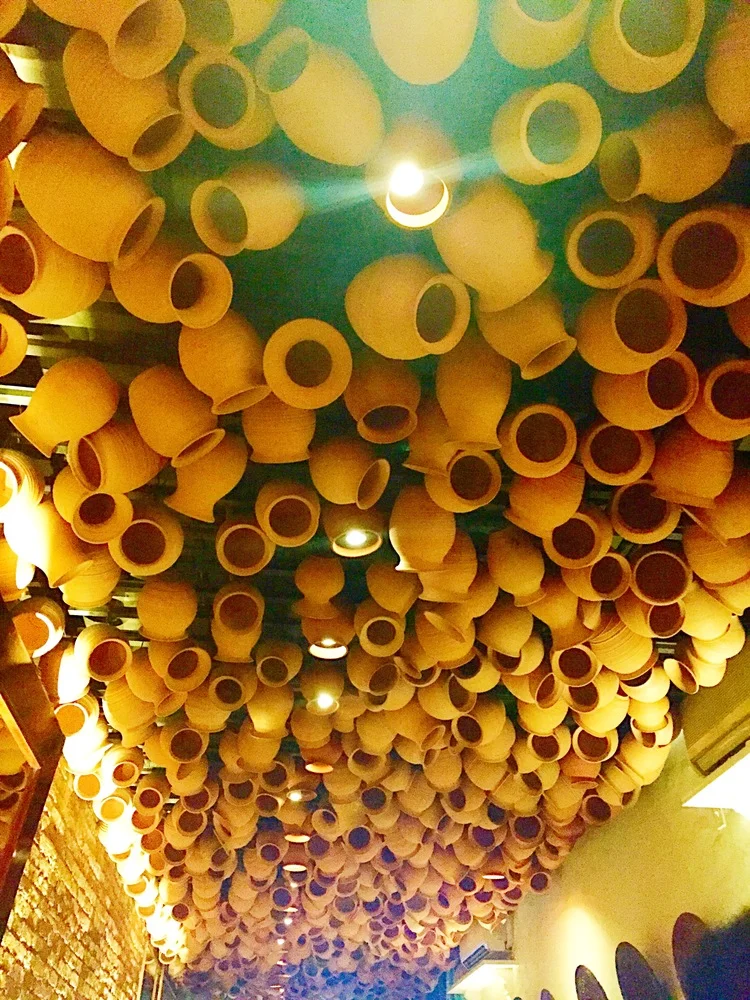 This medium-sized restaurant had a lovely, inviting ambiance and was immediately calming with traditional Greek music beckoning one's attention, a safe haven from the grunge and activity outside. The dim setting was soothing and the ceiling of clay pots was spectacular.