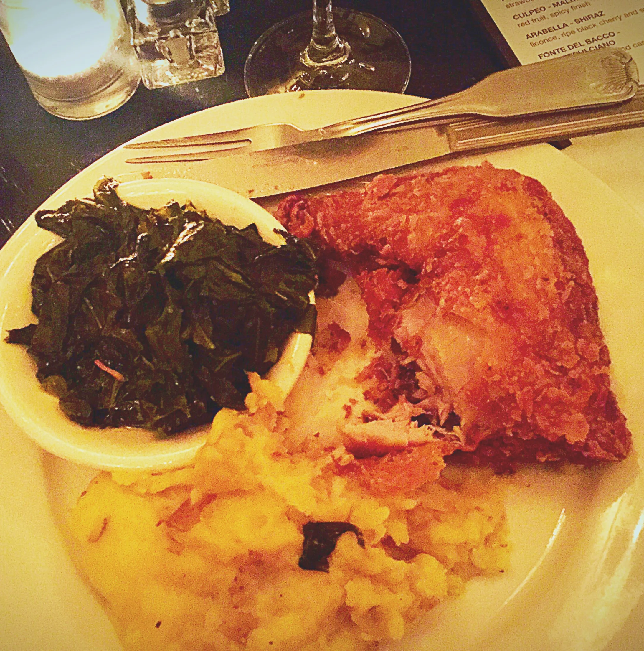 I got the quintessential fried chicken, with mashed potatoes and collard greens as side dishes. It was pretty good, but I have had better. It was expensive for the quantity of food. Then again, I may be looking at it from a biased "Amy Ruth's" lens - their portions are huge and it's always delicious. The service wasn't great - we had to wait close to 20 minutes before the waitress took our order. It was busy though, so I cut her some slack, but the establishment, as a whole, should have had more staff on deck for the number of customers. There were only two servers.